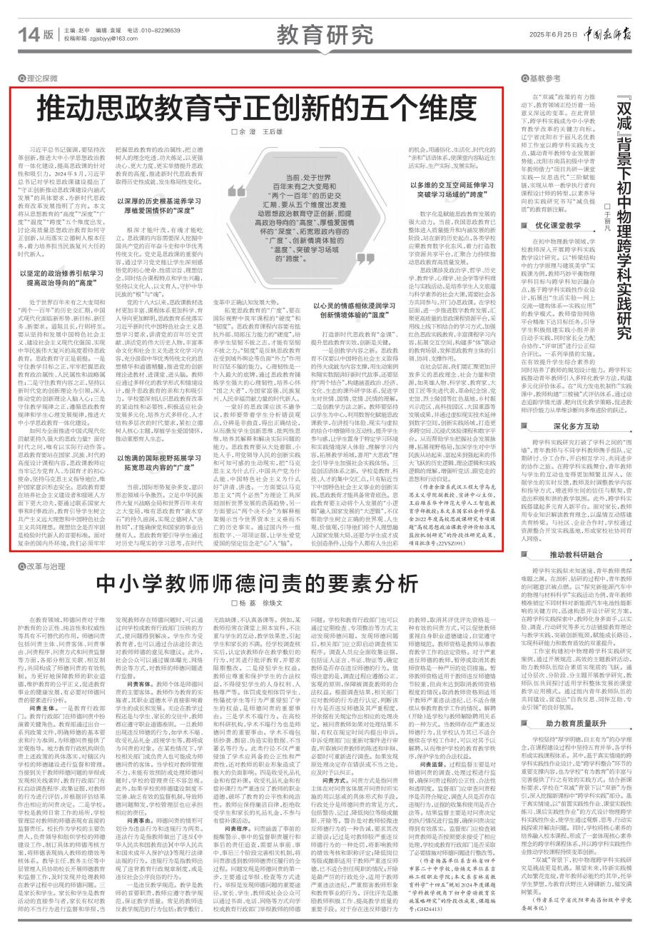 本网讯(通讯员 余澄)6月25日,,,,,,,,我院余澄先生的理论文章《推动思政教育守正立异的五个维度》在《中国西席报》刊发。。。。。文章从思政教育的“高度”“深度”“广度”“温度”“跨度”五个维度切入,,,,,,,,系统叙述了高质量头脑政治教育守正立异的路径:提升政治导向的“高度”、厚植爱国情怀的“深度”、拓宽思政内容的“广度”、立异情境体验的“温度”、突破学习场域的“跨度”,,,,,,,,旨在资助学生掌握时代脉搏,,,,,,,,拓展视野名堂,,,,,,,,深刻明确中华民族从站起来、富起来到强起来伟大奔腾蕴含的历史逻辑、理论逻辑与实践逻辑,,,,,,,,增强听党话、跟党走的头脑自觉和行动自觉,,,,,,,,从而落实立德树人基础使命,,,,,,,,着力作育继续民族再起大任的时代新人。。。。。
