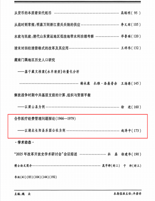 本网讯(通讯员 赵泽中)我院赵泽中先生在《中国经济史研究》揭晓题为《相助医疗经费治理问题探论(1966—1979)——以湖北长阳县乐园公社为例》的论文。。。。。。